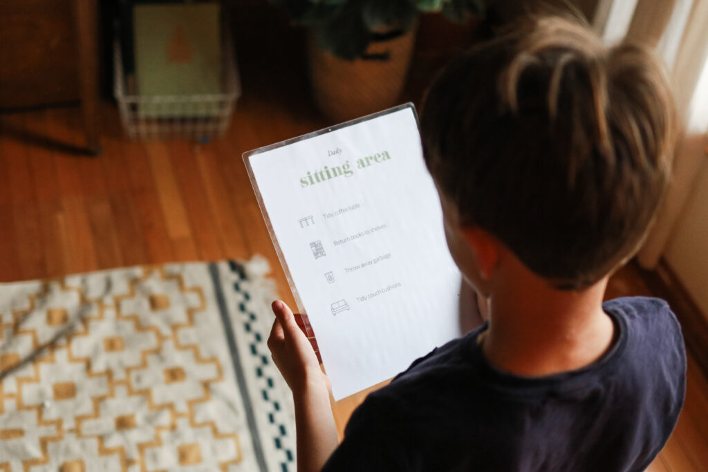 In the morning, after breakfast and Family Gather, I send my kids outside to play while I clear the table and tidy up a bit. After individual learning time and lunchtime, my kids do their “zones” and chores (you get more details in my housecleaning and chores video).